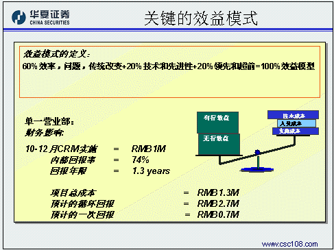 華夏證券經(jīng)紀(jì)業(yè)務(wù)總部的姚磊作為唯一的成功應(yīng)用案例代表,主要是和與會的金融機(jī)構(gòu)分享在客戶關(guān)系管理規(guī)劃方面的一些成功經(jīng)驗(yàn)。華夏證券認(rèn)為,對于證券公司的經(jīng)紀(jì)業(yè)務(wù)來講,客戶關(guān)系管理的主要目標(biāo)應(yīng)該是把客戶關(guān)系管理系統(tǒng)的核心功能融入開戶、交易、服務(wù)、咨詢等四個與客戶互動的過程之中,比如:客戶資料規(guī)戶整合形成統(tǒng)一的客戶號,管理客戶交易偏好和產(chǎn)品偏好上的變化,配合多種渠道建立一對一銷售流程,客戶終身價(jià)值管理。在風(fēng)險(xiǎn)控制方面,華夏證券同樣貢獻(xiàn)了寶貴的經(jīng)驗(yàn),在這方面他們認(rèn)為最重要的方面是要做好高層領(lǐng)導(dǎo)的灌輸和培訓(xùn)工作,讓企業(yè)的高層領(lǐng)導(dǎo)對于客戶關(guān)系管理有一個正確的理解,從而對于項(xiàng)目的投資有一個合理的預(yù)期和實(shí)證,通俗一點(diǎn)說,就是首先為整個項(xiàng)目找一個合適的發(fā)起人。第二點(diǎn)要注意,要有專業(yè)的項(xiàng)目管理隊(duì)伍,這其實(shí)就是集成商選擇方面的風(fēng)險(xiǎn)。除此之外,還要對項(xiàng)目要有一個明確的定義,關(guān)注每一步提交的結(jié)果,在項(xiàng)目過程中就隨時發(fā)現(xiàn)問題、解決問題。