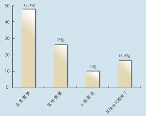 在問(wèn)到對(duì)CRM的熟悉程度方面,有12家表示熟悉,占到63.2%,另有7家表示不熟悉,說(shuō)明許多企業(yè)已經(jīng)對(duì)CRM有一定了解,不過(guò)也仍有相當(dāng)大的市場(chǎng)空間。其中有8家建立了CRM系統(tǒng),占到42%,計(jì)劃建立的有9家,占到47.4%,而有2家表示短期不會(huì)建立。從調(diào)查發(fā)現(xiàn),幾乎所有受訪者都接受和認(rèn)同CRM,盡管有一些企業(yè)還不熟悉,但在調(diào)查問(wèn)卷中對(duì)此表現(xiàn)出極大的興趣。在CRM的采購(gòu)動(dòng)機(jī)上,有9家表示是為了提高業(yè)務(wù),占到將近一半的比例(47.4%),而有5家表示出于企業(yè)宣傳,2家屬于上級(jí)主管部門要求,有3家表示是出于同行的示范。調(diào)查顯示,企業(yè)獲得CRM的信息來(lái)源很廣,最多的是通過(guò)報(bào)刊雜志的廣告,有6家,占31.6%,而上級(jí)推薦和供應(yīng)商推薦各有4家,各占21%,有兩家是集成商推薦,此外還有3家通過(guò)展會(huì)獲得相關(guān)信息。