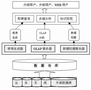 三個層次簡單明了,但在實際實施時,卻需要應用數(shù)據(jù)挖掘、人工智能、機器學習等多個領(lǐng)域的理論和技術(shù),以及統(tǒng)計學、決策科學、計算機科學等方面專業(yè)人才的密切合作,才能從數(shù)據(jù)倉庫的海量數(shù)據(jù)中淘出所需要的“金”;跀(shù)據(jù)倉庫的CRM體系結(jié)構(gòu)如圖所示。