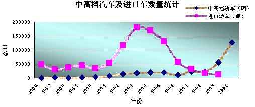 第三階段:1999年以后的快速增長(zhǎng)階段。1999年中高檔汽車產(chǎn)銷量結(jié)束了六年的徘徊局面,首次突破5萬(wàn)輛,比上年增長(zhǎng)了1.5倍,在轎車市場(chǎng)中的占有率升到9.7%。2000年中高檔汽車的產(chǎn)量又實(shí)現(xiàn)翻倍,增長(zhǎng)率為232.46%,年產(chǎn)量達(dá)到127,676臺(tái)。進(jìn)口中高檔汽車數(shù)量也超過(guò)了3萬(wàn)臺(tái),僅日本車的進(jìn)口量就達(dá)23,502臺(tái)。