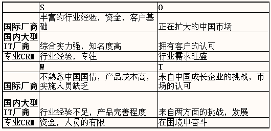 國(guó)內(nèi)的大型軟件公司,ERP+CRM的優(yōu)勢(shì)。為了擴(kuò)展其產(chǎn)品線的需要,也在近幾年進(jìn)入了CRM領(lǐng)域。用友公司的金種子計(jì)劃,金碟公司的東方明珠計(jì)劃逐漸加強(qiáng)投入,神州數(shù)碼與臺(tái)灣軟件公司的合作恐怕也不會(huì)不對(duì)這樣一塊蛋糕有所想得。