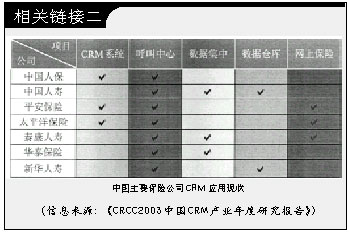 據(jù)某IT媒體2002年末的調(diào)研,只有不到1/5的中國(guó)保險(xiǎn)公司擁有客戶(hù)關(guān)系管理系統(tǒng),但是近六成的保險(xiǎn)公司計(jì)劃在近期內(nèi)實(shí)施CRM;另一份調(diào)查則顯示中國(guó)保險(xiǎn)業(yè)過(guò)去3年的IT投入平均達(dá)到9.36億元,幾乎所有的保險(xiǎn)公司都在從不同側(cè)面開(kāi)展CRM建設(shè)。CRM在中國(guó)保險(xiǎn)業(yè)的應(yīng)用,到底是處于落伍還是冒進(jìn)狀態(tài),成為一個(gè)意味深長(zhǎng)的話(huà)題。