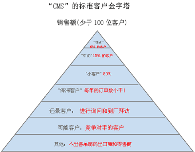 搜集了去年的銷售數(shù)量之后,“CMS”得出了以下的客戶金字塔。由于高端20%的核心客戶占總收入的80%,因此使用以上的方法來保留他們很重要。除此之外,對(duì)該公司來說通過獲取歐洲和南美地區(qū)的新客戶來增加客戶基數(shù)也是十分必要的。