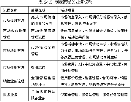 根據(jù)CRM軟件的總體目標,項目組詳細審核每個業(yè)務(wù)的流程,并按照流程對軟件進行定制。所制定的流程包括三大業(yè)務(wù)領(lǐng)域的業(yè)務(wù),見表24.3。