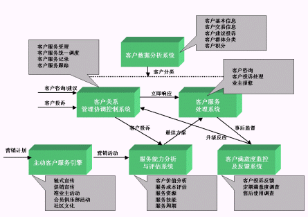 目的是保證和提高客戶服務(wù)的工作效率與質(zhì)量水平。例如,當(dāng)客戶滿意度監(jiān)測(cè)與反饋系統(tǒng)將客戶信息反饋給協(xié)調(diào)控制系統(tǒng)后,后者立刻要求客戶盈利能力評(píng)估系統(tǒng)進(jìn)行評(píng)估,并提出最佳方案,然后向客戶服務(wù)處理系統(tǒng)發(fā)出指令,由它進(jìn)行實(shí)施。