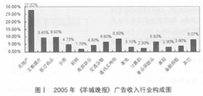廣告客戶在報(bào)紙投放廣告的目的在于說(shuō)服讀者成為其產(chǎn)品或服務(wù)的消費(fèi)者,他們最感興趣的是向那些最有可能成為其消費(fèi)者的讀者做廣告,而“報(bào)紙讀者與廣告目標(biāo)受眾的相關(guān)性決定了廣告信息是否能夠到達(dá)廣告客戶所希望的人群”。為此,廣告客戶更愿意在其目標(biāo)消費(fèi)群接觸率高的報(bào)紙上投放廣告。由于《羊城晚報(bào)》的讀者群具有學(xué)歷較高、職業(yè)較穩(wěn)定、收入較高、消費(fèi)能力較強(qiáng)等特點(diǎn),因此成為房地產(chǎn)、汽車、電訊、家具等耐用消費(fèi)品行業(yè)塑造品牌的平臺(tái)。另外,《羊城晚報(bào)》的讀者以家庭訂戶為主,他們對(duì)健康、教育、休閑、娛樂(lè)比較關(guān)注,因此醫(yī)藥、文化教育、食品保健品、旅游等廣告在羊城晚報(bào)也占有較大比例(見(jiàn)圖Ⅰ,統(tǒng)計(jì)期間為2005年1月-10月)。