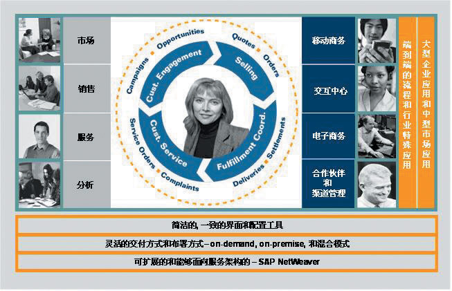 mySAP CRM不僅包含了企業(yè)市場(chǎng)營(yíng)銷、銷售、服務(wù)、分析等功能,還通過(guò)渠道伙伴、現(xiàn)場(chǎng)和移動(dòng)商務(wù)、交互中心、電子商務(wù)等各種交互渠道形成完整的閉環(huán)式設(shè)計(jì)的解決方案。在提供深入的行業(yè)應(yīng)用和傳統(tǒng)的部署方式的同時(shí),mySAP