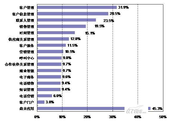 。。調(diào)查顯示,2007年有45.3%的企業(yè)還未應(yīng)用CRM信息化系統(tǒng)。在已經(jīng)應(yīng)用該系統(tǒng)的企業(yè)中,CRM系統(tǒng)應(yīng)用主要就是客戶(hù)管理,占到31.9%;其次是客戶(hù)信息管理和聯(lián)系人管理,這些應(yīng)用比例集中在23~31%之間;其他應(yīng)用還有銷(xiāo)售管理(19.5%)、時(shí)間管理(15.1%)、供應(yīng)商關(guān)系管理(12.8%)、客戶(hù)服務(wù)(11.5%)和營(yíng)銷(xiāo)管理(10.5%)等,呼叫中心、合作伙伴關(guān)系管理、商業(yè)智能、電子商務(wù)、電話(huà)銷(xiāo)售、知識(shí)管理、電話(huà)營(yíng)銷(xiāo)等比例均在10%以下。