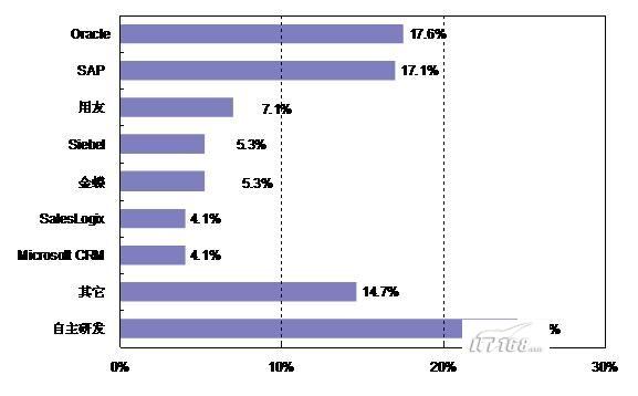 。。 在開(kāi)展了CRM系統(tǒng)應(yīng)用的企業(yè)中,CRM系統(tǒng)品牌認(rèn)知率最高的是ORACLE和SAP,分別占17.6%和17.1%;其他品牌還有用友(7.1%)、Siebel(5.3%)、金碟(5.3%)、Sales Logix(4.1%)和Microsoft CRM(4.1%)等;另有24.7%的企業(yè)是自主開(kāi)發(fā)的CRM系統(tǒng)。
