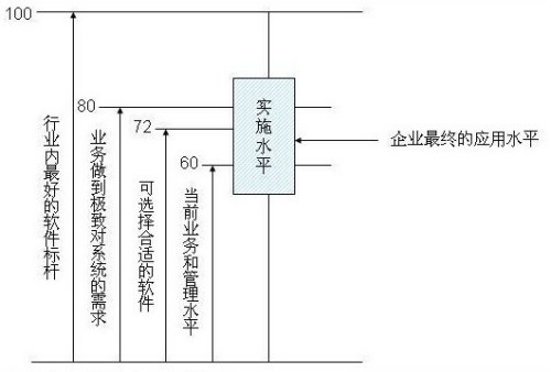如果用一個數(shù)量化的概念來表達(dá)的話,假定行業(yè)內(nèi)最好的軟件是100分,企業(yè)做到極致對系統(tǒng)的需求可能是80分,當(dāng)然也可能沒有一個軟件能滿足企業(yè)所有的需求,但從整體上,一個企業(yè)的主體需求一定在行業(yè)內(nèi)最好的軟件標(biāo)桿之下。而當(dāng)前的業(yè)務(wù)和管理水平一般到不了極致,假設(shè)是60分,那選擇的軟件70-75分一定是合適的,高于當(dāng)前需求,而不要高得太多,最終的實(shí)施水平是一個區(qū)間,這取決于實(shí)施商的能力和企業(yè)的能力,可能會低于企業(yè)當(dāng)前業(yè)務(wù)和管理水平,也可能使系統(tǒng)超水平發(fā)揮,而企業(yè)最終的應(yīng)用水平一般就在這個區(qū)間里游動了。這個模型看起來很理論化,操作時需要考慮很多的因素,但是非常有價值的判斷標(biāo)準(zhǔn)。