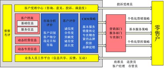 煙草行業(yè)的CRM項目是建立在煙草行業(yè)獨特的業(yè)務流程和特點之上的。在煙草行業(yè),CRM系統(tǒng)往往并不是作為一個獨立的系統(tǒng)存在,而是要與營銷系統(tǒng)、專賣系統(tǒng)等緊密聯(lián)系,形成相互共享資源的一個整體。因此,煙草行業(yè)CRM業(yè)務模型(如圖)要根據(jù)企業(yè)的經(jīng)營目標、任務、市場管理的工作需要,為營銷、服務和專賣等部門制定營銷策略、服務策略和管控策略。