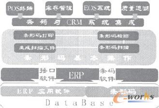 條碼技術(shù)的成熟使企業(yè)可以大范罔地得到應(yīng)用,充分解決企業(yè)管理系統(tǒng)中海量數(shù)據(jù)的管理和采集的難題,把條碼技術(shù)與CRM進行無縫集成,為企業(yè)的ERP打下基礎(chǔ),具體集成框架圖如圖2。