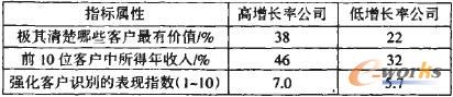 對《財富》雜志排名前l(fā)000位公司的200位經(jīng)理調(diào)查后得出結(jié)論,企業(yè)增長性與清楚的識別客戶有明顯的聯(lián)系(見表1)。該表反映了高增長率的企業(yè)比低增長率的企業(yè)更加懂得客戶識別的重要性,并運用技巧來強化核心客戶為企業(yè)創(chuàng)造更多價值。