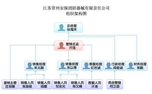 百會(huì)CRM模擬了“江蘇常州安保消防器械有限責(zé)任公司”的組織架構(gòu),設(shè)置了一套專門針對(duì)產(chǎn)品銷售型、生產(chǎn)制造型企業(yè)的CRM系統(tǒng),對(duì)CRM系統(tǒng)所提供的模塊和不同職位的人員所具備的權(quán)限都進(jìn)行了界定,這樣一套系統(tǒng)就足夠以銷售和生產(chǎn)制造為主的公司進(jìn)行使用。該公司的具體組織架構(gòu)見下圖。