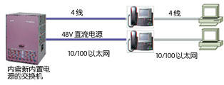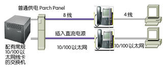 第二種方式是,在局域網(wǎng)交換機(jī)和電話機(jī)之間增加一個專用供電設(shè)備,一邊是多路普通網(wǎng)絡(luò)線從局域網(wǎng)交換機(jī)接入,另一邊則是增加了供電的多路網(wǎng)絡(luò)線,接出到IP電話機(jī)。這種設(shè)備一般安置在機(jī)房,只是增加了機(jī)房內(nèi)的網(wǎng)線排列。如下圖: