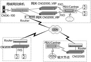 根據(jù)實際的話務(wù)量和人員數(shù)量,選用FXO接口2-8路語音的CNG2000 IP語音網(wǎng)關(guān)1臺?梢赃x用PBX應(yīng)用方式或向電信公司申請Centrex業(yè)務(wù)。