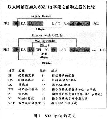 這種解決方案是根據(jù)對IEEE 802.1p/q協(xié)議字段的處理來區(qū)分不同優(yōu)先級業(yè)務(wù)的。IEEE 802.1p/q同屬于一個(gè)子集,它在傳統(tǒng)的以太網(wǎng)幀頭中加入了4個(gè)字節(jié),其中802.1p占3位。802.1p延伸了802.1d的協(xié)議,利用3位優(yōu)先級位可以最多提供8個(gè)優(yōu)先等級。而802.1q利用VI(VLAN