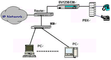 OKI公司的IVG BV1250互聯(lián)網(wǎng)絡(luò)IP電話語音網(wǎng)關(guān)就是一種非常好的選擇,完全基于H.323 Ver2.0協(xié)議,實現(xiàn)語音和傳真在因特網(wǎng)上傳輸。使用BV1250 進(jìn)行IP電話和IP FAX通信時,可以感覺到與傳統(tǒng)的電話或傳真所提供的服務(wù)毫無區(qū)別。運(yùn)用BV1250,可通過互聯(lián)網(wǎng)(Internet/Intranet)將電話機(jī)、傳真機(jī)和PBX進(jìn)行互連,建立專用的IP電話網(wǎng)絡(luò)。BV1250使用的是靜態(tài)IP地址,因此不能將BV1250連接到使用DHCP(動態(tài)主機(jī)通信規(guī)程)的互聯(lián)網(wǎng)上。常用連接方式如下圖所示: