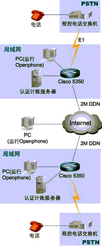 組成這個(gè)IP電話的網(wǎng)絡(luò)系統(tǒng)由處于兩個(gè)不同國家的區(qū)域組成(見附圖1網(wǎng)絡(luò)拓?fù)浣Y(jié)構(gòu)),每個(gè)區(qū)域都采用了一臺(tái)Cisco 5350路由器(以下簡稱5350)作為網(wǎng)絡(luò)的核心,這臺(tái)5350路由器具有兩個(gè)WAN口和兩個(gè)以太網(wǎng)口,能夠直接連接到本地的局域網(wǎng)和DDN基帶調(diào)制解調(diào)器。和普通電話網(wǎng)絡(luò)(PSTN)相連接則是通過添加一個(gè)E1接口卡4PRI和一個(gè)IP語音數(shù)據(jù)處理單元NP60,來實(shí)現(xiàn)E1(30條ISDN的B信道)和路由器相連接,實(shí)時(shí)地對(duì)語音數(shù)據(jù)進(jìn)行H.323壓縮編碼。