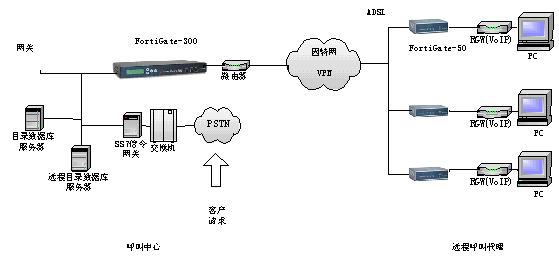 呼叫中心和代理之間傳輸可以選用寬帶高速ADSL網(wǎng)絡(luò),構(gòu)成以一個呼叫中心和眾多遠(yuǎn)端通信的綜合語音/數(shù)據(jù)VPN網(wǎng)絡(luò)。VoIP/Data ADSL VPN網(wǎng)絡(luò)是呼叫系統(tǒng)的解決辦法,它要求系統(tǒng)的性能好,穩(wěn)定性和可靠性高,語音質(zhì)量好, 響應(yīng)時間短,網(wǎng)絡(luò)配置和維護(hù)簡單方便。