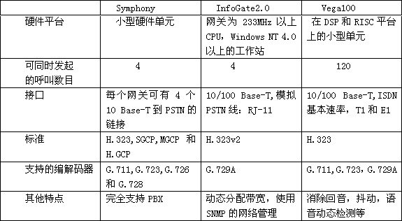 企業(yè)這部分市場與通信公司那部分不同。第一,企業(yè)不需要運載公眾呼叫,因此產(chǎn)品的規(guī)模較小。第二,企業(yè)愿意用連接到公司內(nèi)部網(wǎng)絡(luò)的IP電話產(chǎn)品代替?zhèn)鹘y(tǒng)的PBXs,因此這部分產(chǎn)品必須提供基本的PBX功能,比如呼叫保持和呼叫轉(zhuǎn)移。表2是一些相關(guān)的產(chǎn)品。