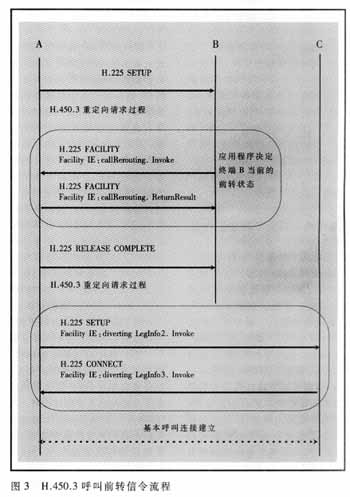 圖3顯示了可編程呼叫前轉(zhuǎn)的信令流程,在終端B的控制下通過把呼叫重新定向到一個新的目的地址而實現(xiàn)呼叫前轉(zhuǎn)。終端B在接收到SETUP消息后,發(fā)送一個包含前轉(zhuǎn)目的終端C地址的信令消息到呼叫發(fā)起終端A。然后終端A直接建立到終端C的連接,同時向終端C指明該業(yè)務(wù)的性質(zhì)和相應(yīng)信息。
