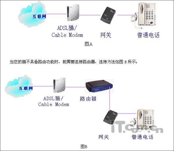 網(wǎng)關(guān)聯(lián)接至RJ45網(wǎng)線,普通電話機(jī)聯(lián)接在PHONE端口,該網(wǎng)關(guān)可通過市話線路或網(wǎng)絡(luò)撥打電話,原有市話線聯(lián)接在PSTN口上,直撥號碼時(shí)為通過網(wǎng)絡(luò)撥打,加前置碼#0*通過原有市話線撥打,如停電,所有電話均自動從原有市話線路撥出。