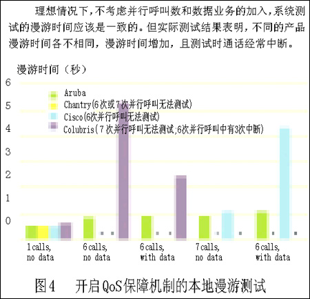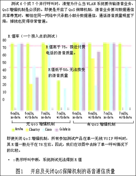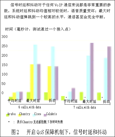 上述操作是為了啟動QoS保障機制后,系統(tǒng)就能取得顯著的成效。但只有Aruba的系統(tǒng)在所有測試中保持了一貫的良好表現(xiàn),在具有QoS保障機制的情況下,甚至在最惡劣的情況下(7個并行VoIP呼叫并加入數(shù)據(jù)流業(yè)務),它仍然能夠傳送出和付費電話通話質(zhì)量一樣的信號。Aruba的系統(tǒng)在打開QoS增強機制的情況下,系統(tǒng)承載業(yè)務最空閑和最繁忙的測試結(jié)果差別很小。