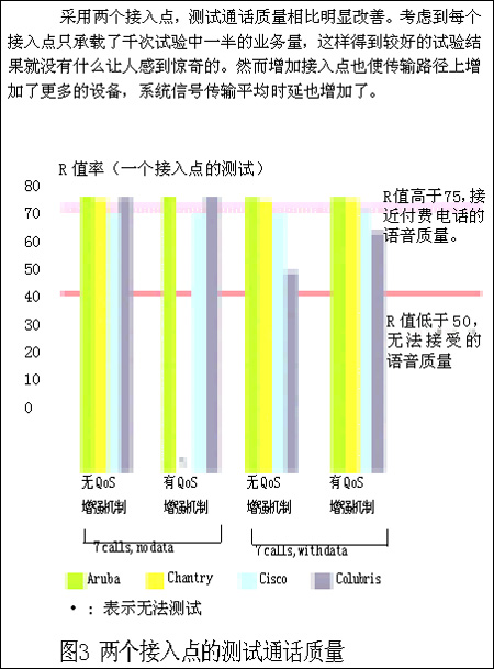 因此,采用兩個接入點,R值測量結(jié)果通常是非常高的?紤]到每個接入點只承載上次試驗中一半的業(yè)務量,這樣得到較好的試驗結(jié)果就沒有什么讓人感到驚奇的。同時設置更多的接入點雖說可以改善系統(tǒng)性能,但也帶來了一些問題: