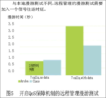 Aruba公司的設備在漫游測試中表現(xiàn)出色,它的平均漫游切換時間在0.5~1秒之間,雖然這已經(jīng)是所有的測試設備中表現(xiàn)最好的,但是通話者還是能夠察覺這種時延。而Cisco公司的設備,由于時間的限制,我們只進行了7個并行呼叫的漫游測試,平均漫游時間為0.433秒到1.053秒,而加入數(shù)據(jù)流業(yè)務時,在7個并行VoIP呼叫時,系統(tǒng)的時延達到了4.324秒。