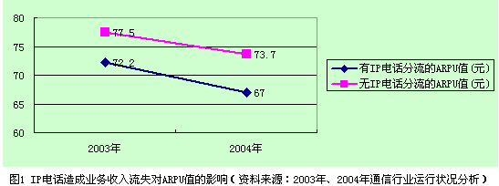 IP電話使ARPU值降低。2003年和2004年全國電信業(yè)務(wù)收入及電話用戶總數(shù)分別為4610億元、53199.8萬戶和5205億元、64726.7萬戶,平均ARPU值2003年為72.2元,2004年為67元。通過分析計(jì)算,由于IP電話造成的業(yè)務(wù)收入流失使2003年的平均ARPU值降低了5.3元,
