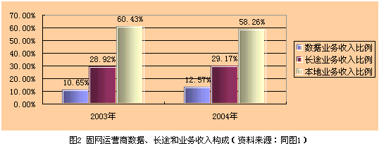 目前數(shù)據(jù)業(yè)務(wù)收入與話音業(yè)務(wù)收入相差懸殊,通過發(fā)展數(shù)據(jù)業(yè)務(wù)彌補(bǔ)VoIP造成的話音收入損失尚需時日。以固網(wǎng)運(yùn)營商為例,2003年和2004年數(shù)據(jù)業(yè)務(wù)、長途業(yè)務(wù)和本地業(yè)務(wù)收入構(gòu)成見圖2所示。