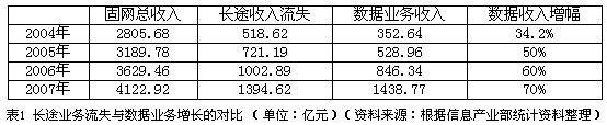 表1 長途業(yè)務(wù)流失與數(shù)據(jù)業(yè)務(wù)增長的對比 (單位:億元)(資料來源:根據(jù)信息產(chǎn)業(yè)部統(tǒng)計(jì)資料整理)