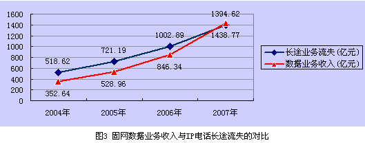 表1顯示,固網(wǎng)運(yùn)營商的數(shù)據(jù)業(yè)務(wù)收入在年均增長10%的情況下,到2007年數(shù)據(jù)業(yè)務(wù)收入才能抵消由IP電話造成的長途業(yè)務(wù)收入的流失,具體情況見圖3所示。