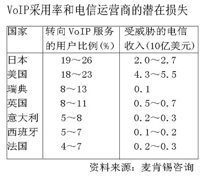 新興的寬帶運(yùn)營(yíng)商紛紛推出寬帶電話業(yè)務(wù),對(duì)傳統(tǒng)電信運(yùn)營(yíng)商的話音業(yè)務(wù)構(gòu)成了嚴(yán)重威脅。如:美國(guó)的AOL、Seednet等互聯(lián)網(wǎng)服務(wù)提供商和MSN、Yahoo等網(wǎng)絡(luò)內(nèi)容提供商等都借助VoIP積極進(jìn)入話音服務(wù)市場(chǎng)。