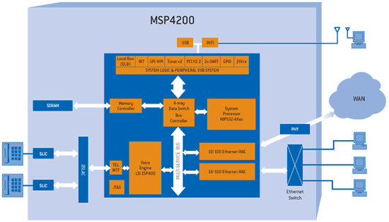 PMC-Sierra VoIP WiFi寬帶路由器方案的核心是MSP4200(見圖),MSP4200支持一個(gè)基于DSP的語音引擎,使得該MIPS處理器在管理、信令和高速IP路由任務(wù)中可發(fā)揮出最佳性能。這種架構(gòu)確保了相當(dāng)于固定線路快速以太網(wǎng)路由速度以及防火墻性能,并能同時(shí)在四個(gè)通道提供VoIP服務(wù)。另外它還有一個(gè)PCI接口以提供更多靈活性,支持各種802.11