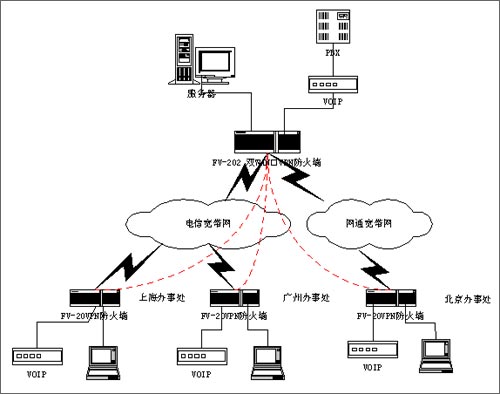 VPN防火墻網(wǎng)關(guān)具有雙WAN口和QOS帶寬管理功能,總部同時接入兩條ADSL線路,通過策略路由,把內(nèi)部網(wǎng)絡(luò)的上網(wǎng)訪問全部從WAN2的ADSL上網(wǎng),而把VOIP和VPN全部通過WAN1的ADSL來傳輸,從而避免了上網(wǎng)的請求占用VPN和VOIP的帶寬。同時,通過對內(nèi)部網(wǎng)絡(luò)不同的業(yè)務(wù)劃分不同的優(yōu)先級,特別是把VOIP的優(yōu)先級做為最高,優(yōu)先轉(zhuǎn)發(fā)VOIP的數(shù)據(jù)包,同時又通過VOIP和VPN傳輸分配最大和最小的保證帶寬,來保護(hù)VOIP業(yè)務(wù)的正常通信。除此之外,F(xiàn)V-202強大的訪問控制功能,特別是對VPN隧道的訪問控制功能,可以對各地的分公司通過VPN訪問總公司的服務(wù)器進(jìn)行控制,為不同的客戶分配不同的權(quán)限,讓遠(yuǎn)程的VPN隧道只能訪問指定的IP地址或相關(guān)的業(yè)務(wù)端口,能很好保證VPN的訪問安全。特別值得一提的是,F(xiàn)V-202支持網(wǎng)通、電信雙線路接入,如果由于北方網(wǎng)通跨網(wǎng)接入,可以在全部申請網(wǎng)通線路,把北方的分支機構(gòu)接入到總部的網(wǎng)通線路,可以避免由于跨網(wǎng)帶來的帶寬瓶頸。在各個分支機構(gòu)配置iRouter的FV-20VPN防火墻,為各個分支機構(gòu)構(gòu)建一道安全的防線,實現(xiàn)與總部的VPN的聯(lián)接。同時,外出的員工或領(lǐng)導(dǎo)通過IPSEC的撥號軟件,實現(xiàn)移動的接入,通過VPN,東莞奧愛斯構(gòu)建全國的融合的安全通信平臺,既可以解決VOIP的被竊聽的風(fēng)險,又能實現(xiàn)實時的數(shù)據(jù)訪問。從而大大地降低公司長途的話費和以往租用數(shù)據(jù)專線的高昂的費用,提高了公司的工作效率,為公司帶來十分明顯的經(jīng)濟效益。