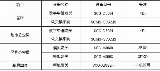 在區(qū)縣局,可采用數(shù)字E1中繼網(wǎng)關(guān)SCG-D3004或采用模擬語音網(wǎng)關(guān)(SCG-A8000);當(dāng)話務(wù)量不是很高時,可采用模擬語音網(wǎng)關(guān)與用戶原有的