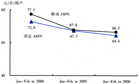 圖4 2004-2006年固定電話與移動(dòng)電話的ARPU對比