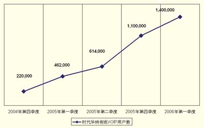 很快時(shí)代華納有線的VoIP業(yè)務(wù)就出現(xiàn)了強(qiáng)勁的增長(zhǎng),2005年的頭幾個(gè)月,其VoIP用戶數(shù)以幾乎每周1萬的速度增加,到2005年第二季度,時(shí)代華納有線就成為全美第二大VoIP提供商。圖1描述了時(shí)代華納有線從2004年到2006年初的VoIP客戶強(qiáng)勁增長(zhǎng)。