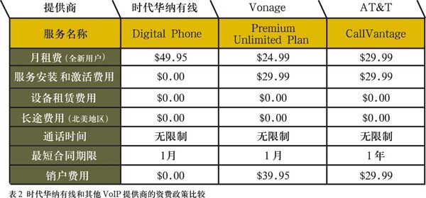 聲稱其1/3的有線電視用戶和一半以上的寬帶用戶訂購(gòu)了其提供的VoIP服務(wù)。對(duì)于時(shí)代華納有線的全新VoIP用戶來說,開通并使用“數(shù)字電話”的費(fèi)用為每月49.95美元,那些時(shí)代華納有線的寬帶用戶只需44.95美元,如果用戶同時(shí)使用有線電視和寬帶,那么只需要39.95美元就可以了,時(shí)代華納有線為所有的服務(wù)(視頻、語音和數(shù)據(jù)接入)提供每月統(tǒng)一的賬單。此外用戶使用“數(shù)字電話”不需要簽訂長(zhǎng)期合同,并享有30天的試用期,相對(duì)于其競(jìng)爭(zhēng)對(duì)手來說賦予了用戶更多的自由。