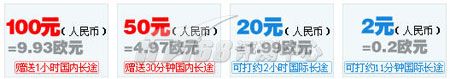 在skype的資費(fèi)列表中,沒有人民幣選項(xiàng),在Tom-Skype的充值選項(xiàng)中,僅提供了四種金額的充值100、50、20、和2元。從官方站點(diǎn)查到的價(jià)格為0.017歐元/分鐘(約合人民幣0.17元/分鐘)