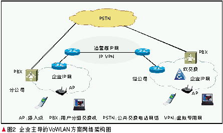 運(yùn)營商將企業(yè)的總部及其各分支機(jī)構(gòu)的企業(yè)網(wǎng)接入自己的電信網(wǎng),通過IP 虛擬專用網(wǎng)(VPN)等技術(shù)將其組建成內(nèi)部互聯(lián)網(wǎng)(Intranet)。運(yùn)營商為企業(yè)提供的VoIP業(yè)務(wù),目前一般是基于軟交換系統(tǒng)的。在企業(yè)中,WLAN手機(jī)和筆記本等WLAN終端通過企業(yè)的WLAN