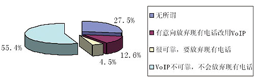 最近《華爾街日報(bào)》刊載了YankeeGroup公司的調(diào)查報(bào)告,對美國人使用VoIP的趨向和目前的一些應(yīng)用狀況進(jìn)行了統(tǒng)計(jì),重點(diǎn)調(diào)查了美國人是否要放棄傳統(tǒng)的固定電話而改用VoIP,具體數(shù)據(jù)參見圖1。從圖中可見人們對放棄固定電話而改用VoIP的意向還不是很高,但已使用VoIP的人群卻是個(gè)龐大的群體,使用VoIP的人口比例已達(dá)15.1%,現(xiàn)使用人數(shù)已達(dá)到了4500多萬戶,具體見表1。另外,目前美國VoIP已從暴利行業(yè)轉(zhuǎn)向微利行業(yè),這點(diǎn)可以從Skype公司收入得到證明,詳見表2。
