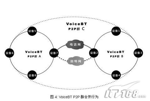 純P2P是采用分布式信息共享技術(shù)實(shí)現(xiàn)的無服務(wù)器網(wǎng)絡(luò)體系結(jié)構(gòu),VoiceBT P2P群是一個采用純P2P技術(shù)并由所有callfreee設(shè)備自發(fā)組成的智能P2P網(wǎng)絡(luò),電話線交互IP定位信息技術(shù)不但可以使網(wǎng)絡(luò)不需要服務(wù)器而且能夠極大的加快網(wǎng)絡(luò)收斂速度和增強(qiáng)網(wǎng)絡(luò)穩(wěn)定性。VoiceBT P2P群基本行為分為合并和查詢兩種。本文用圖例的方式簡要的介紹一下這兩種行為。