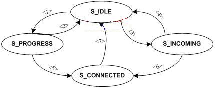 呼叫有四種狀態(tài):“S_IDLE”、“S_PROGRESS”、“S_INCOMING”、“S_CONNECTED”,它們之間的關(guān)系用一個有限狀態(tài)機(jī)來描述,如圖3。