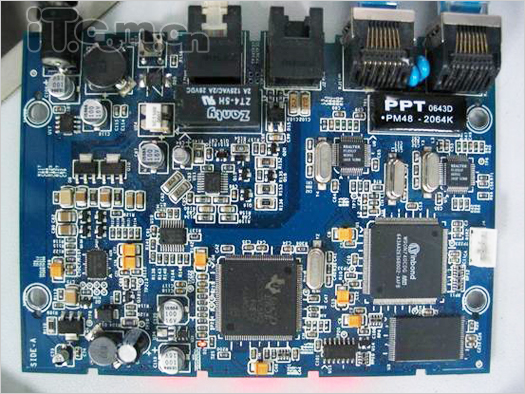 設(shè)備由幾個(gè)螺絲固定,上下兩個(gè)外殼由8個(gè)卡口卡住,卡后連接非常緊密,在沒有特殊器件的情況下不用暴力無(wú)法打開。拆開后,就可以看到下圖的PCB板子,上面密密麻麻的排滿的器件,大體上和通用VoIP適配器方案差不多,但是有些地方不同。