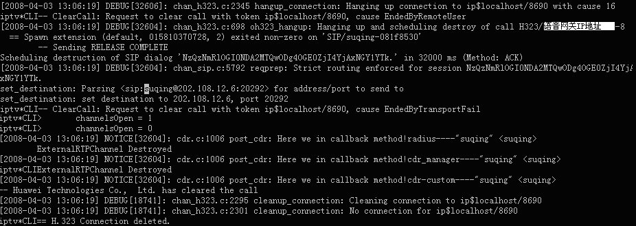 表示軟交換Asterisk與華為8010語音網關的H323連接在此釋放