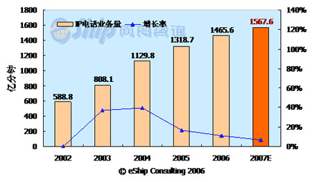從圖中可以看出,國內(nèi)IP電話市場近年呈現(xiàn)出快速增長趨勢,2002-2007年年均增長率為20.7%。預(yù)計(jì)2007年IP電話的通話時(shí)長將達(dá)到1567.6億分鐘,同比增長7%。但從2005年開始,IP電話的增長率呈下降趨勢,這主要是受管制限制和移動(dòng)長途的替代作用所致。