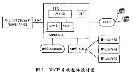 通過對國內外VoIP技術的研究,要面向社會推廣價格低廉的IP電話業(yè)務,普通用戶的電話終端成本,運營商的設備、管理成本都是必須考慮的因素。因此,設計出了一個VoIP系統(tǒng)方案,如圖1所示。